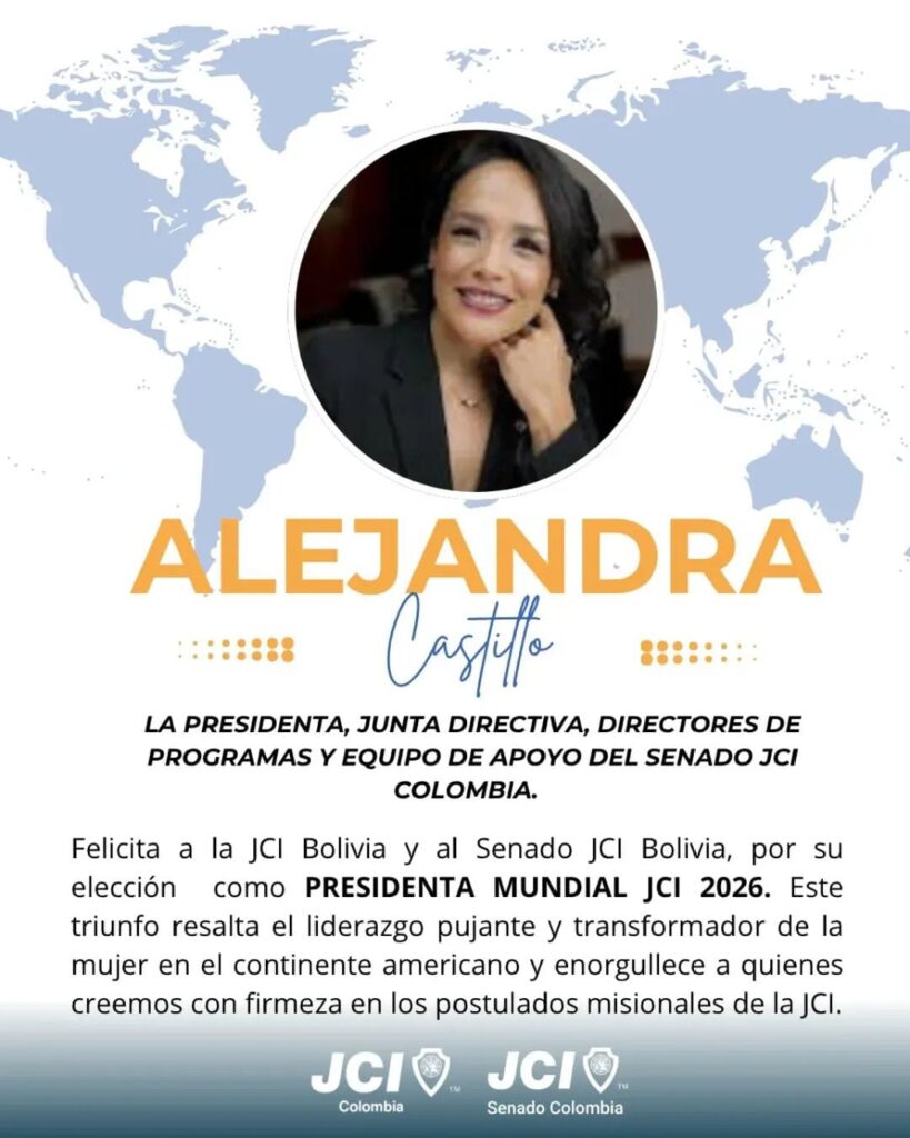 Desde el Senado JCI Colombia celebramos con alegría y admiración la elección de Alejandra Castillo 🇧🇴 como Presidenta Mundial JCI 2026.