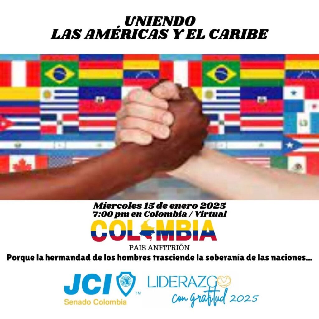 La presidenta del Senado JCI Colombia: Lydia Rosa Toro Marquez, la junta directiva y el equipo de directores 2025, se complace en informarles e invitarlos al evento virtual: «Uniendo las américas y el Caribe». Un espacio para saludar desde el internacionalismo al año 2025. Colombia es el país anfitrión de este evento que busca ratificar nuestro credo cuando dice: «La Hermandad de los hombres, trasciende la soberanía de las naciones..»